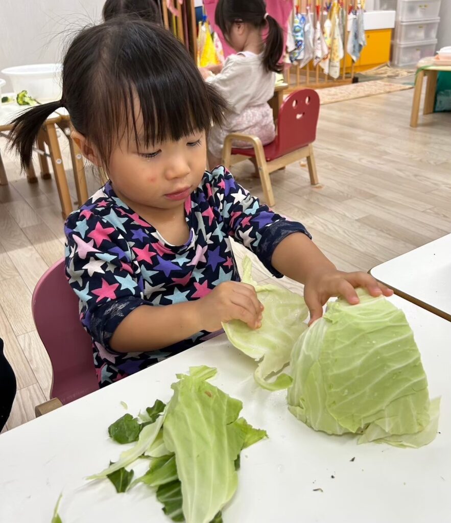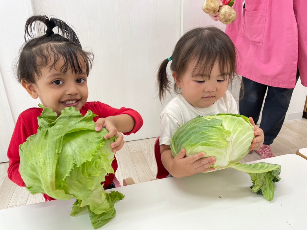 カットされていない野菜を見るのがはじめての子もいるようで、みんな興味津々!