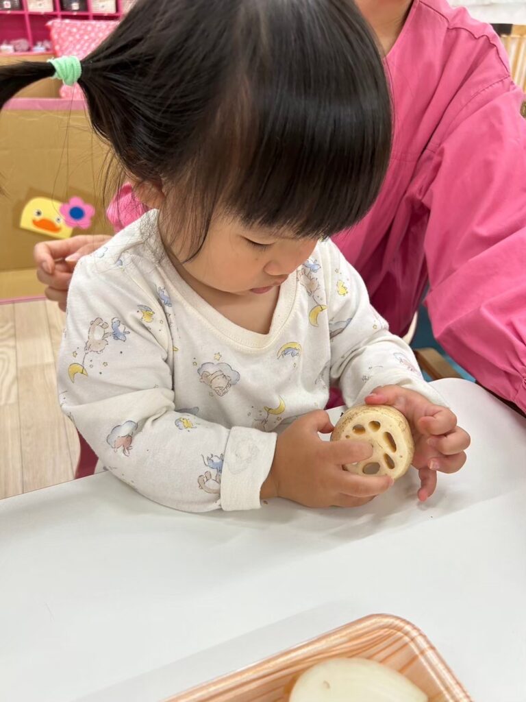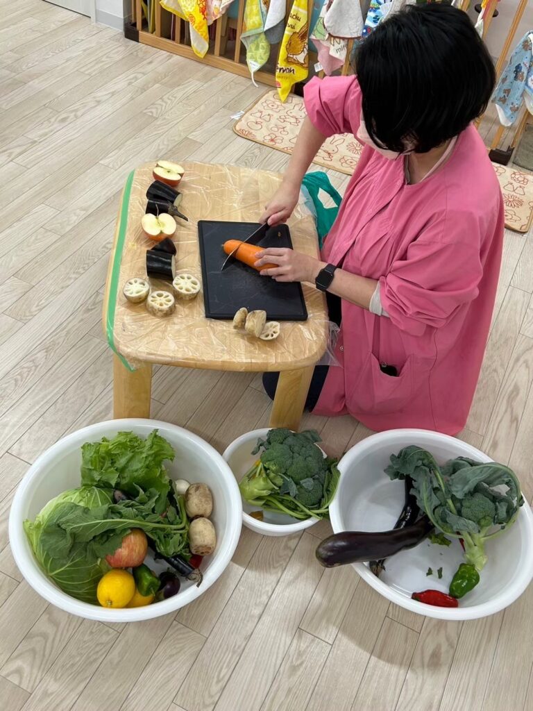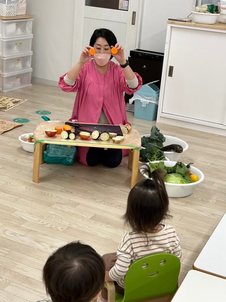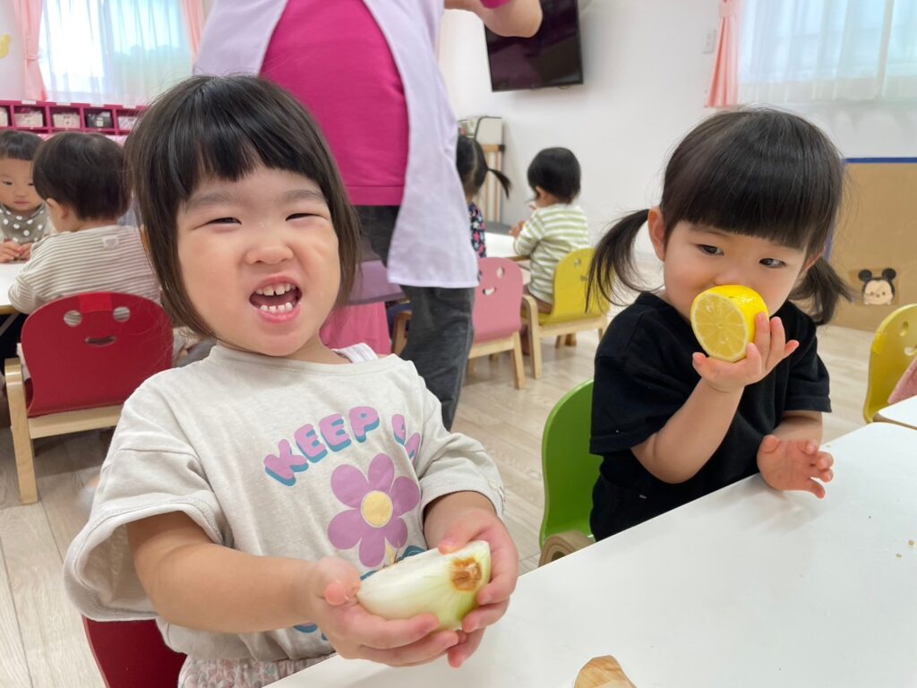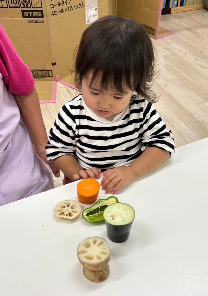 普段食べている野菜や果物に触れたり、断面を見たりして楽しみますよ♪