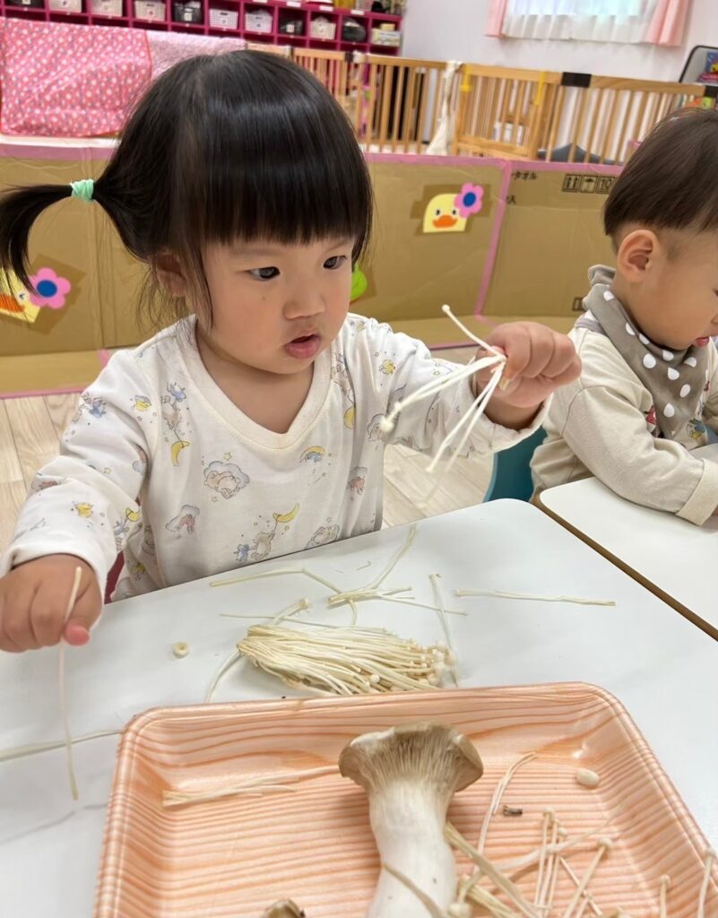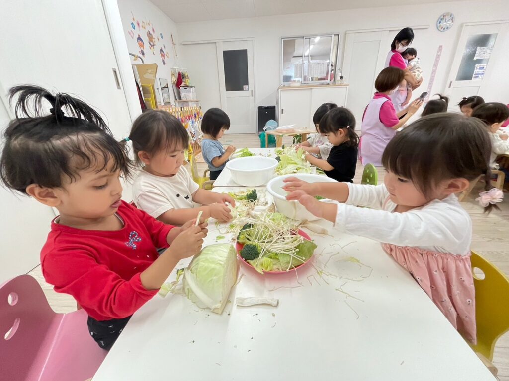 形やにおいを楽しんだ後は野菜を割いたり千切ったりして遊びましたよ。