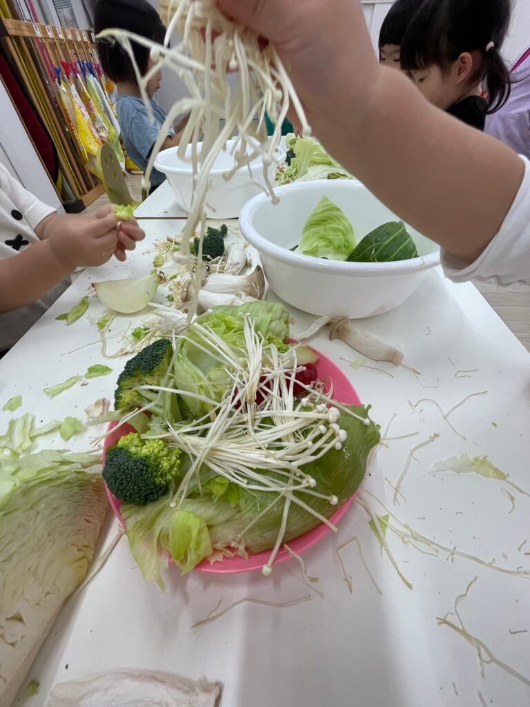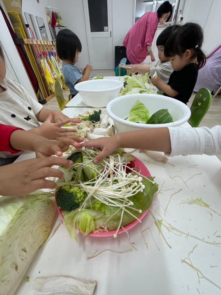 お皿を用意すると小さくなった野菜をみんなでのせはじめました。