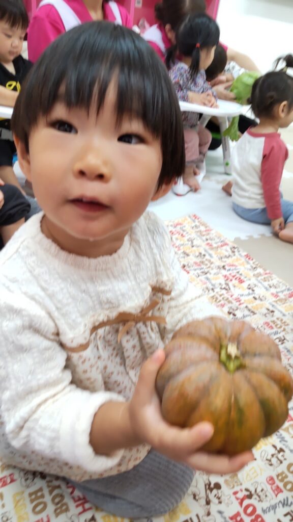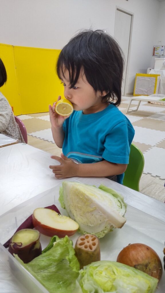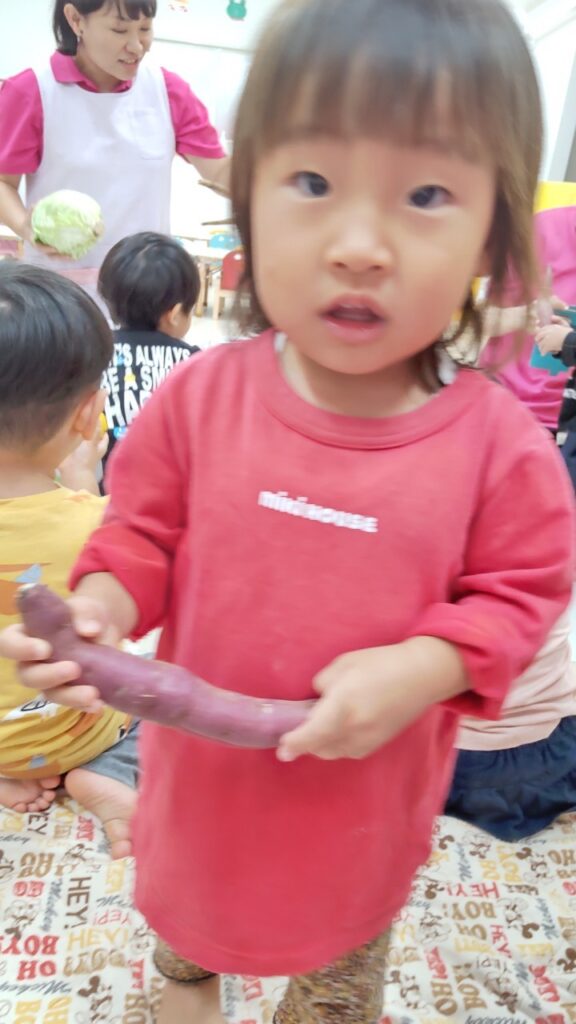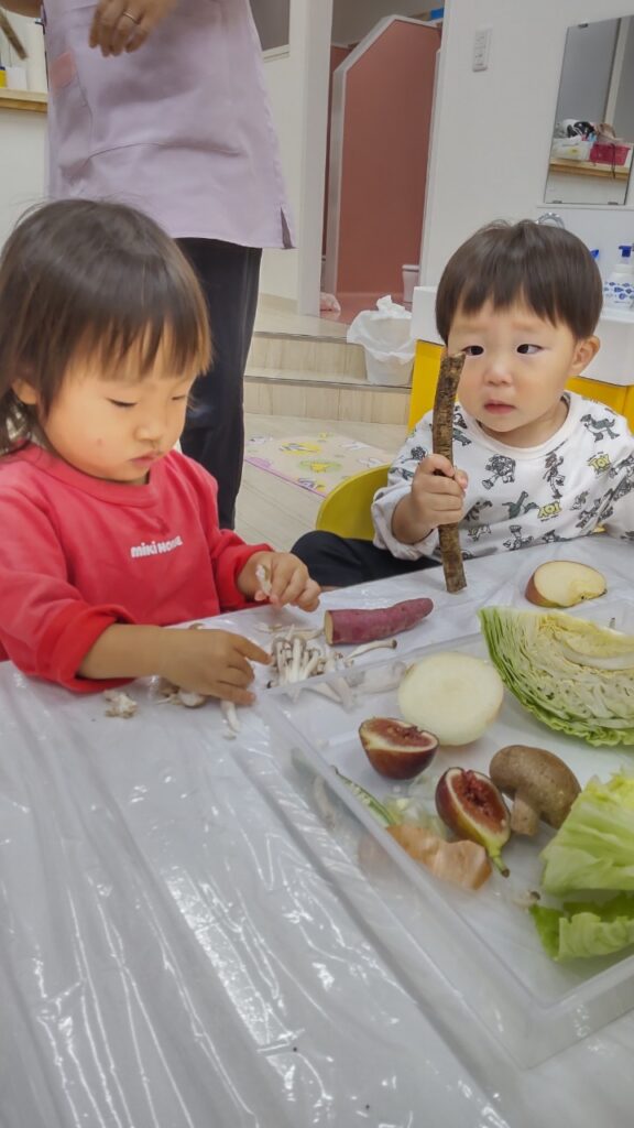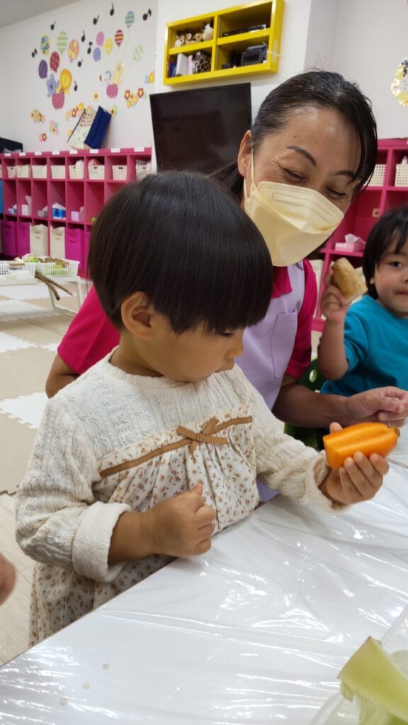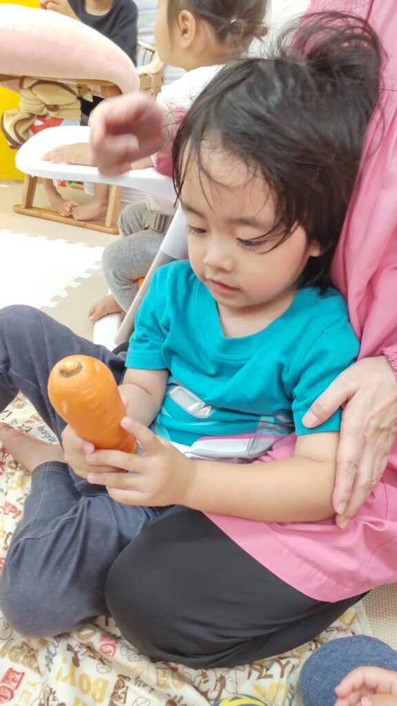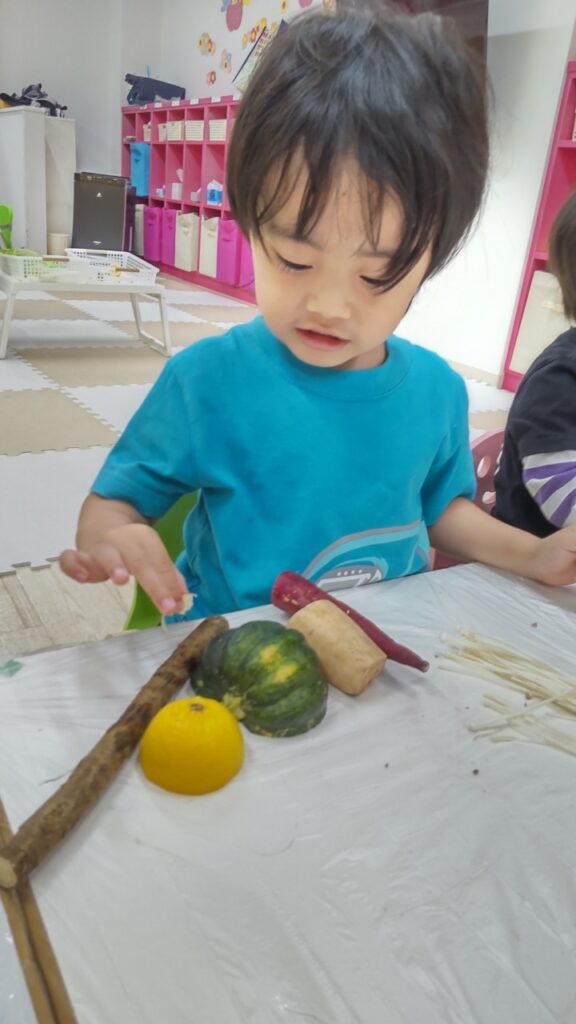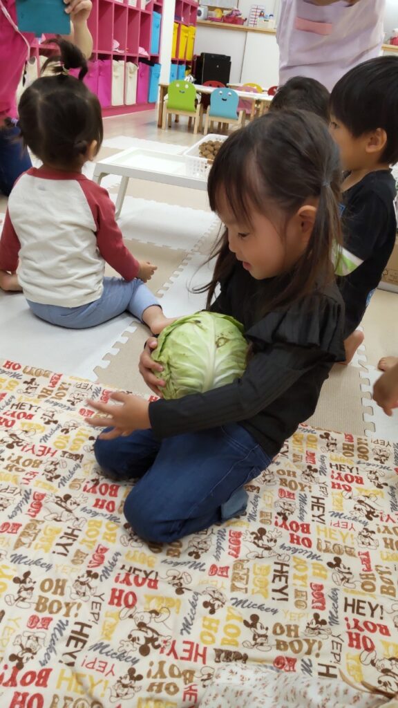 お友だちと順番にいろいろなお野菜に触れていきます^^