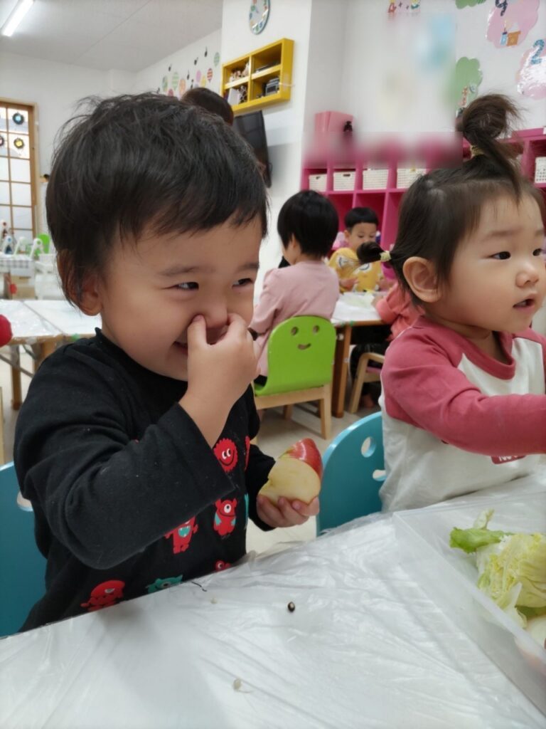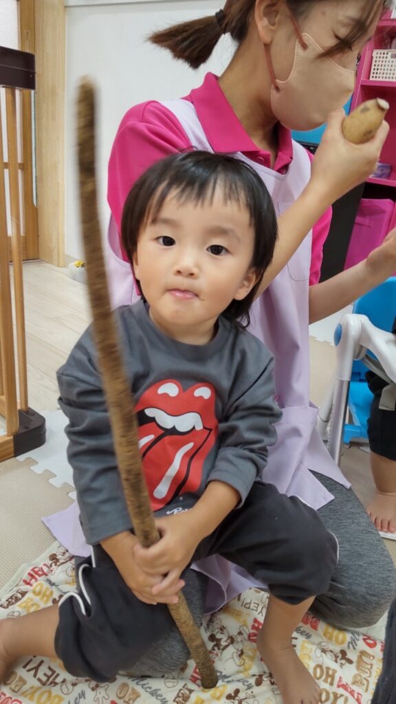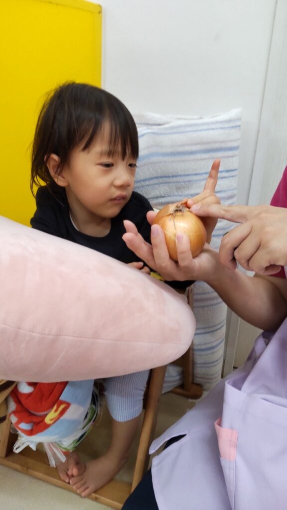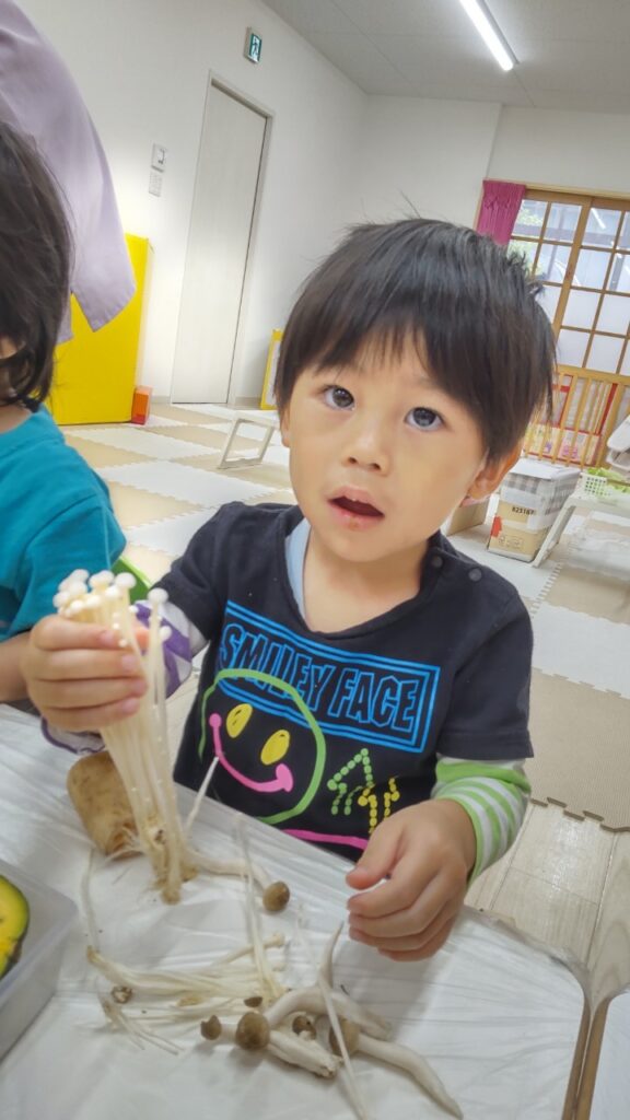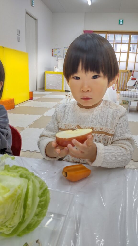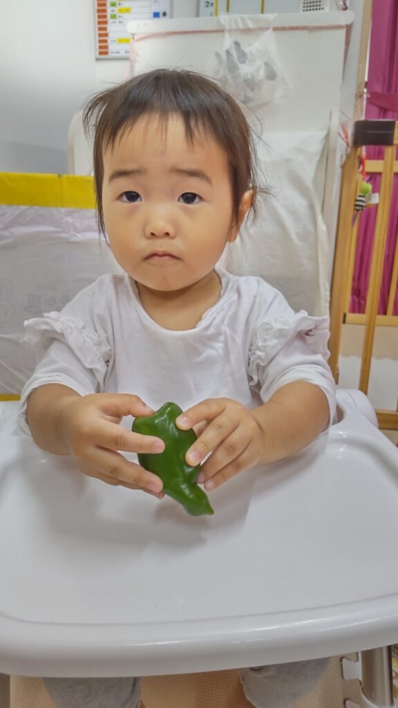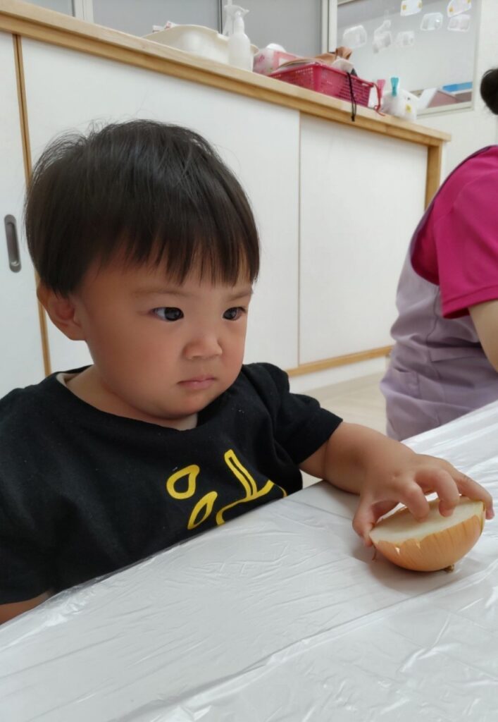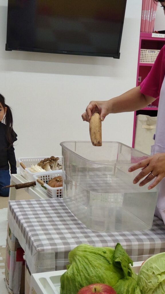 お友だちと順番にいろいろなお野菜に触れていきます^^