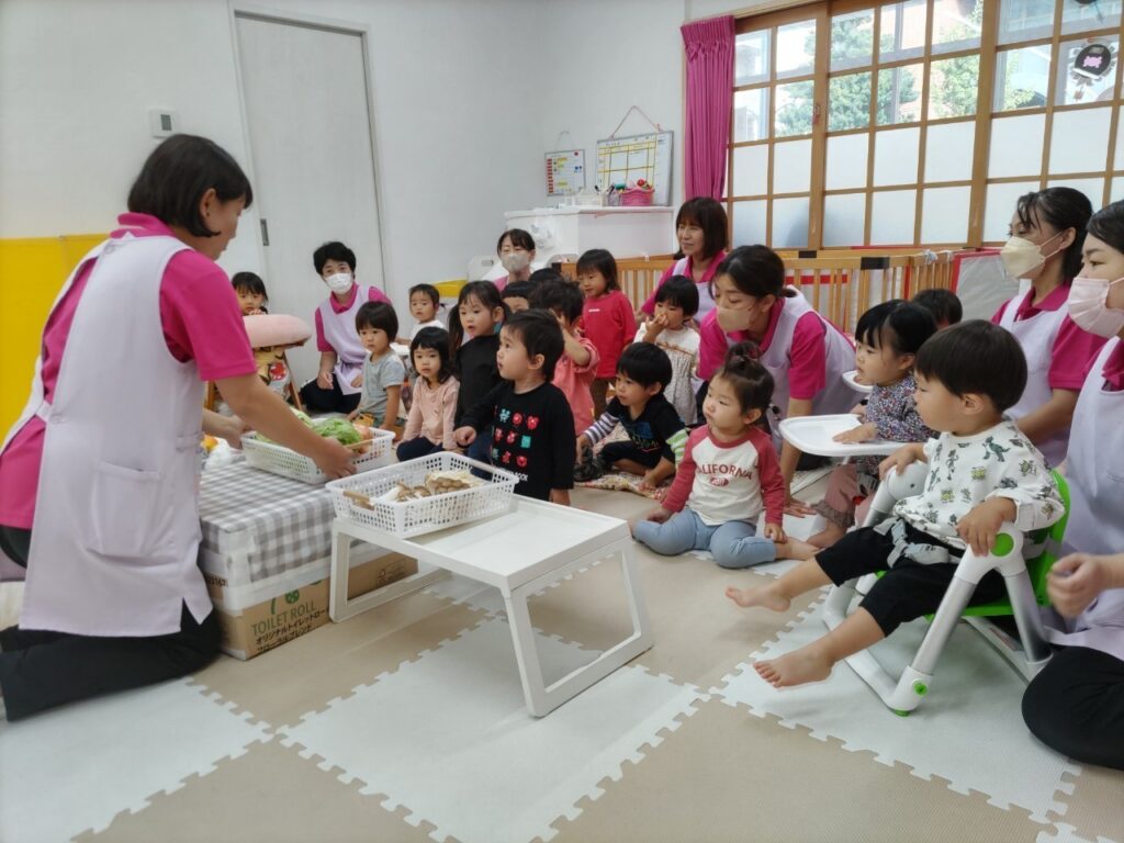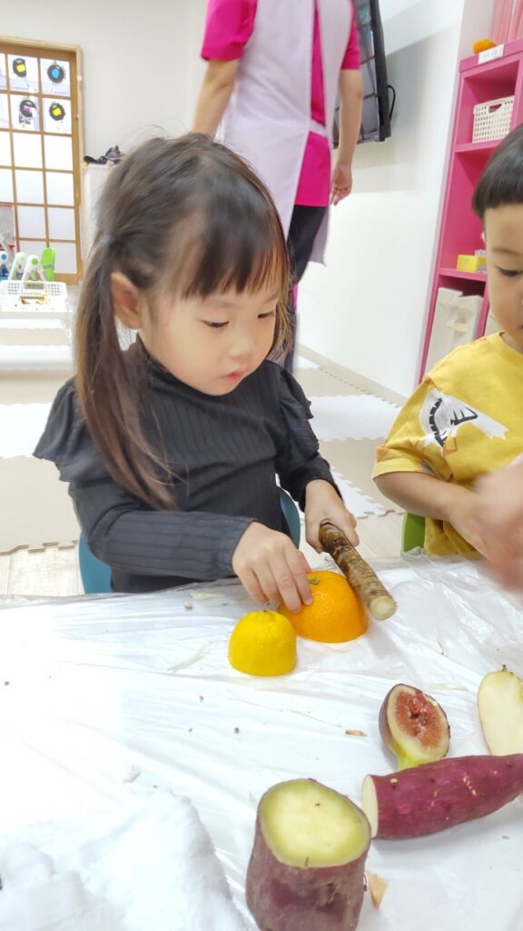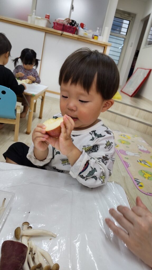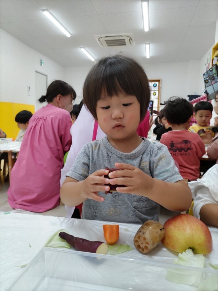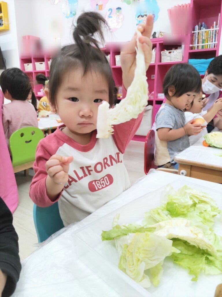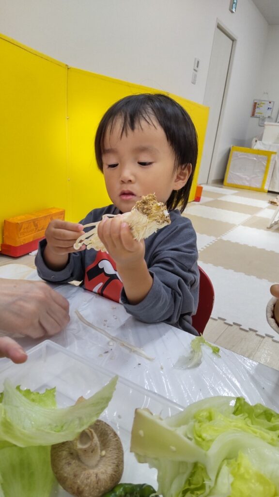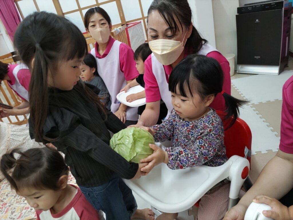 お友だちと順番にいろいろなお野菜に触れていきます^^