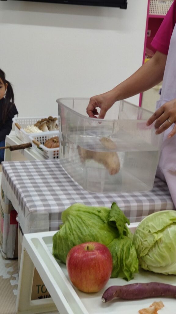 今度は野菜を水の中に入れてみますよ!