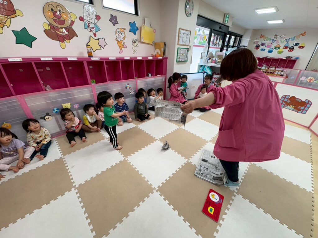 さて、誕生会の日のお楽しみ、感覚遊びです!