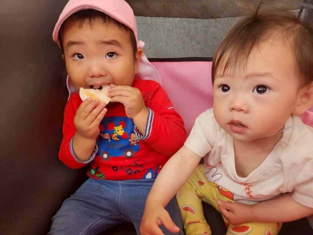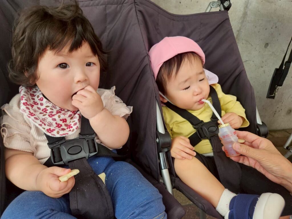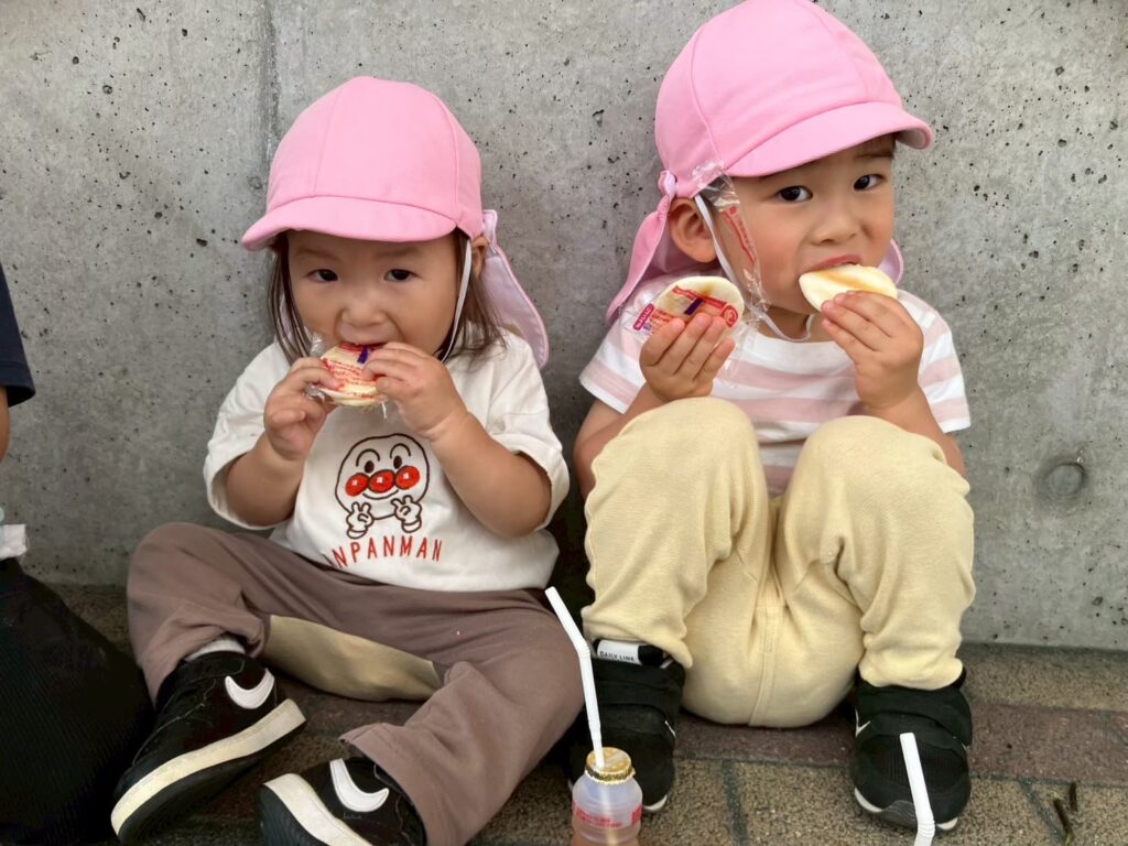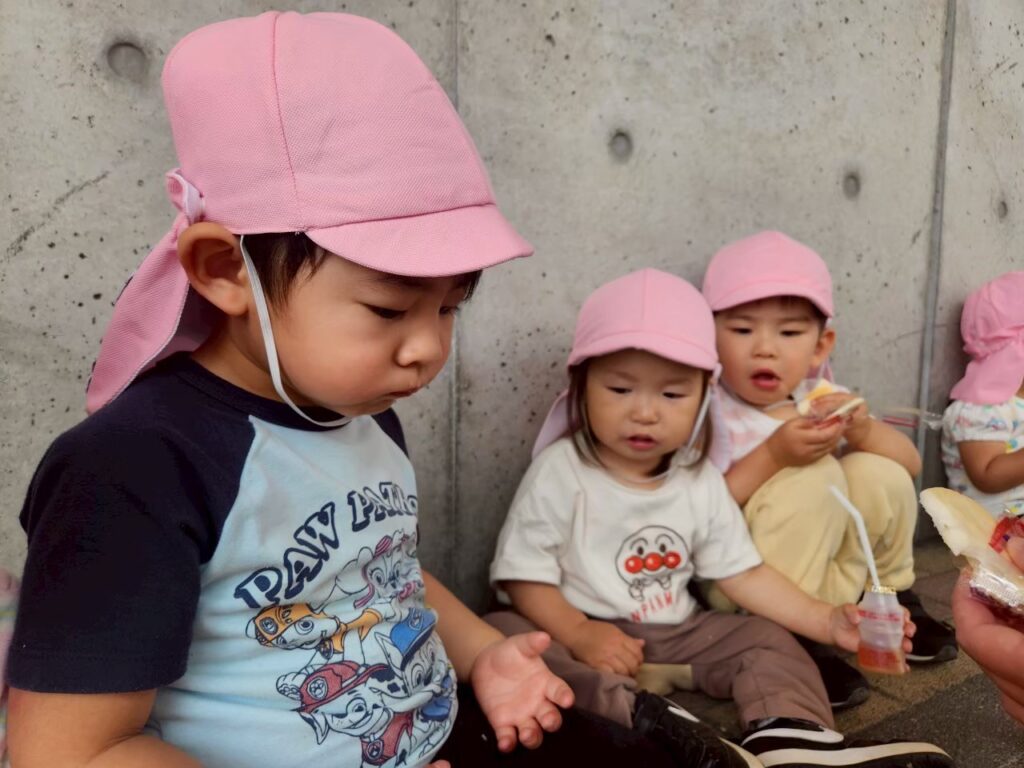 おやつ遠足!ということで、散歩先でおやつを食べピクニック気分を味わいます♪