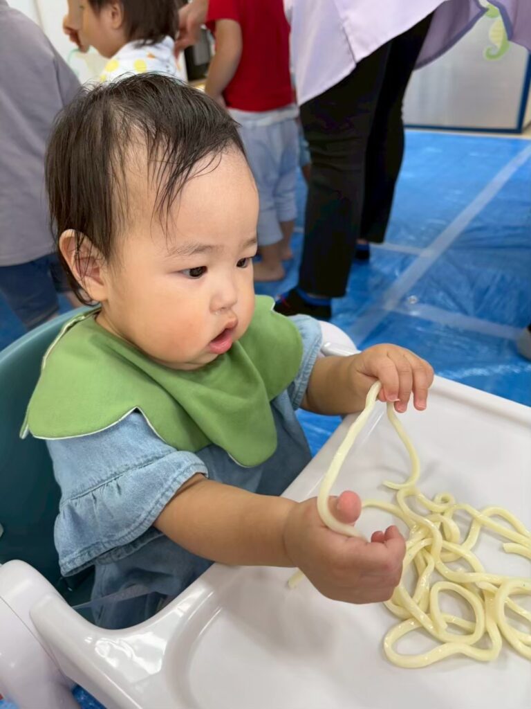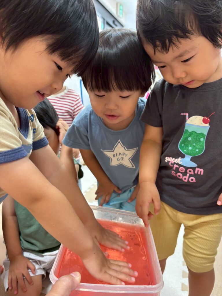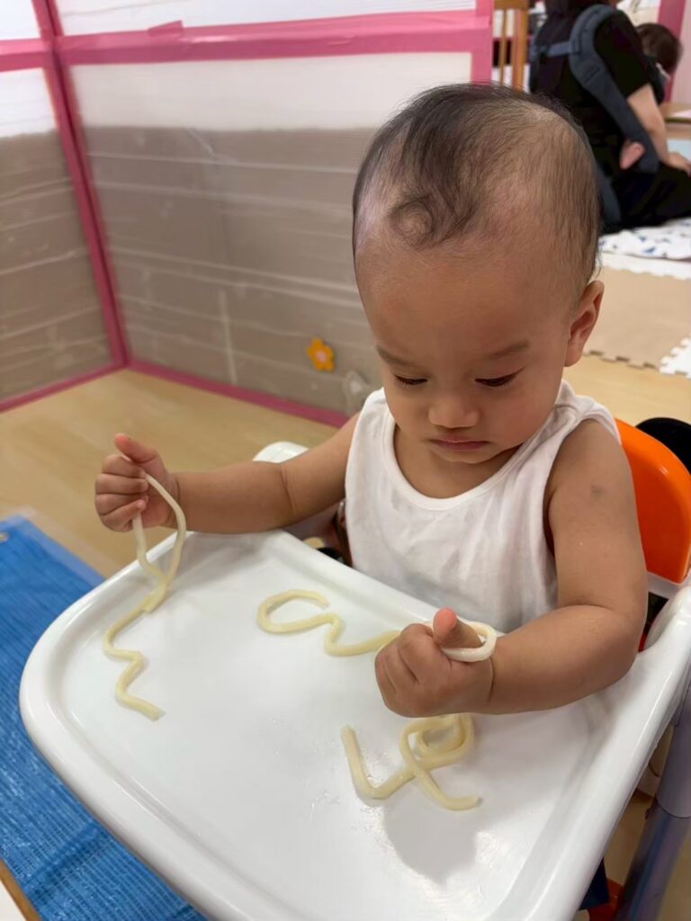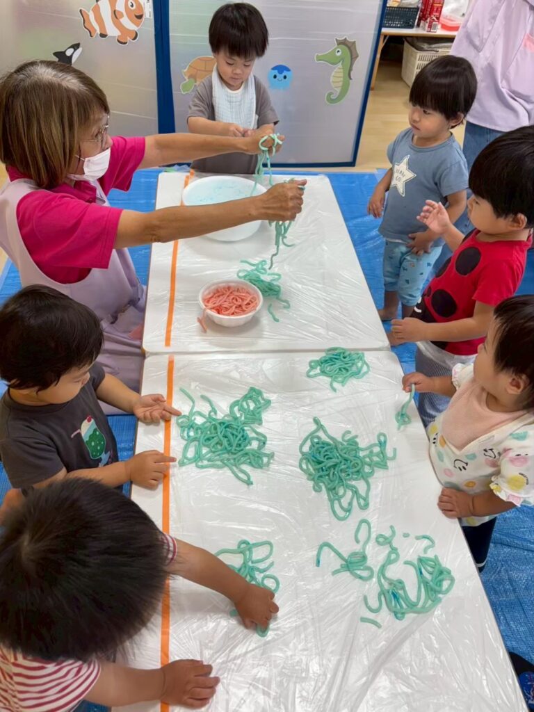 みんなの大好きなゼリーやうどん遊びを通して「固い・やわらかい・冷たい」などの感覚を楽しんだり、手指を使って「握る・つぶす・ちぎる」など手先の器用さや指先の感覚を養ったりすることができました^_^