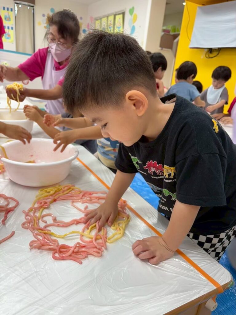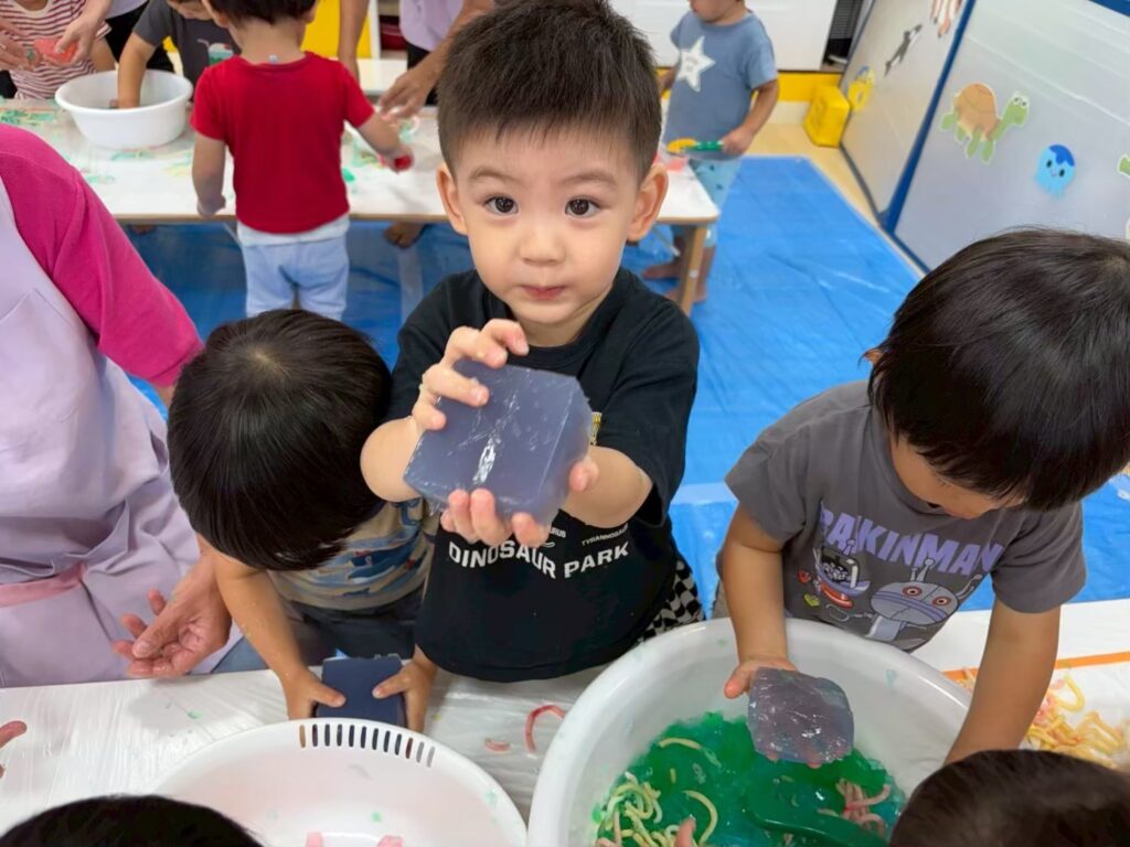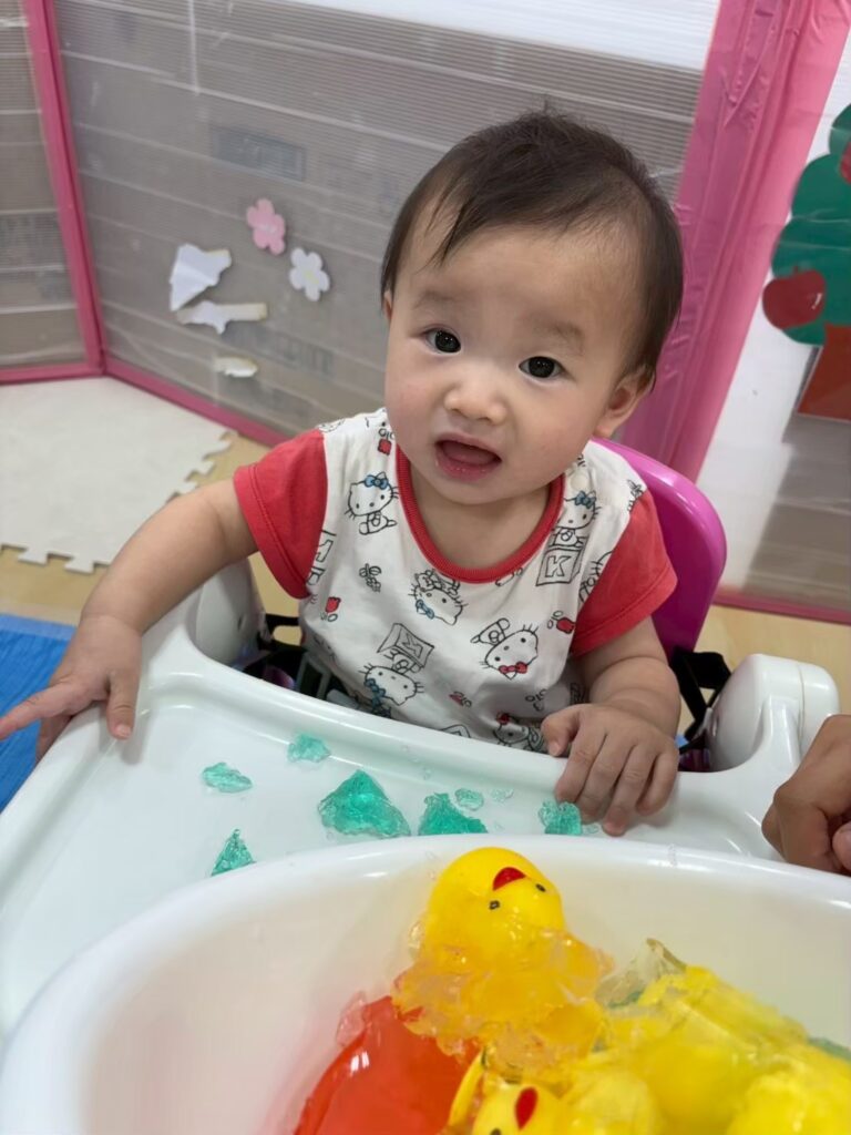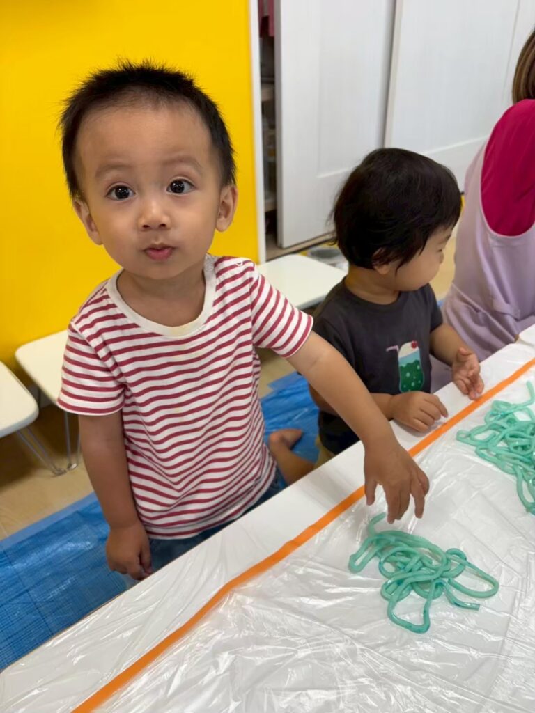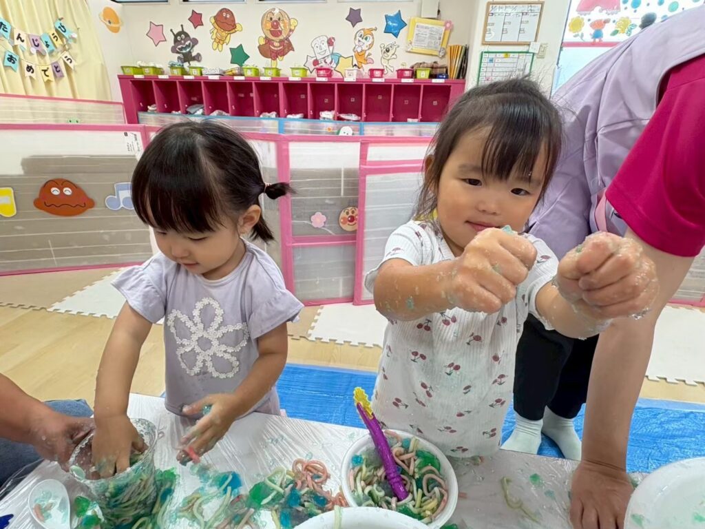 みんなの大好きなゼリーやうどん遊びを通して「固い・やわらかい・冷たい」などの感覚を楽しんだり、手指を使って「握る・つぶす・ちぎる」など手先の器用さや指先の感覚を養ったりすることができました^_^