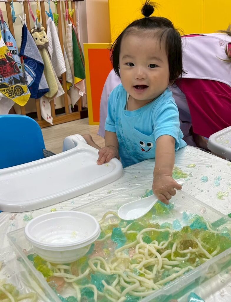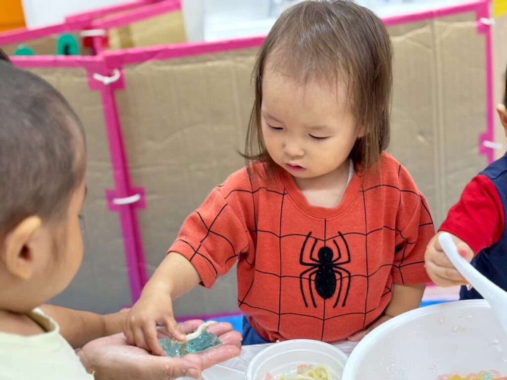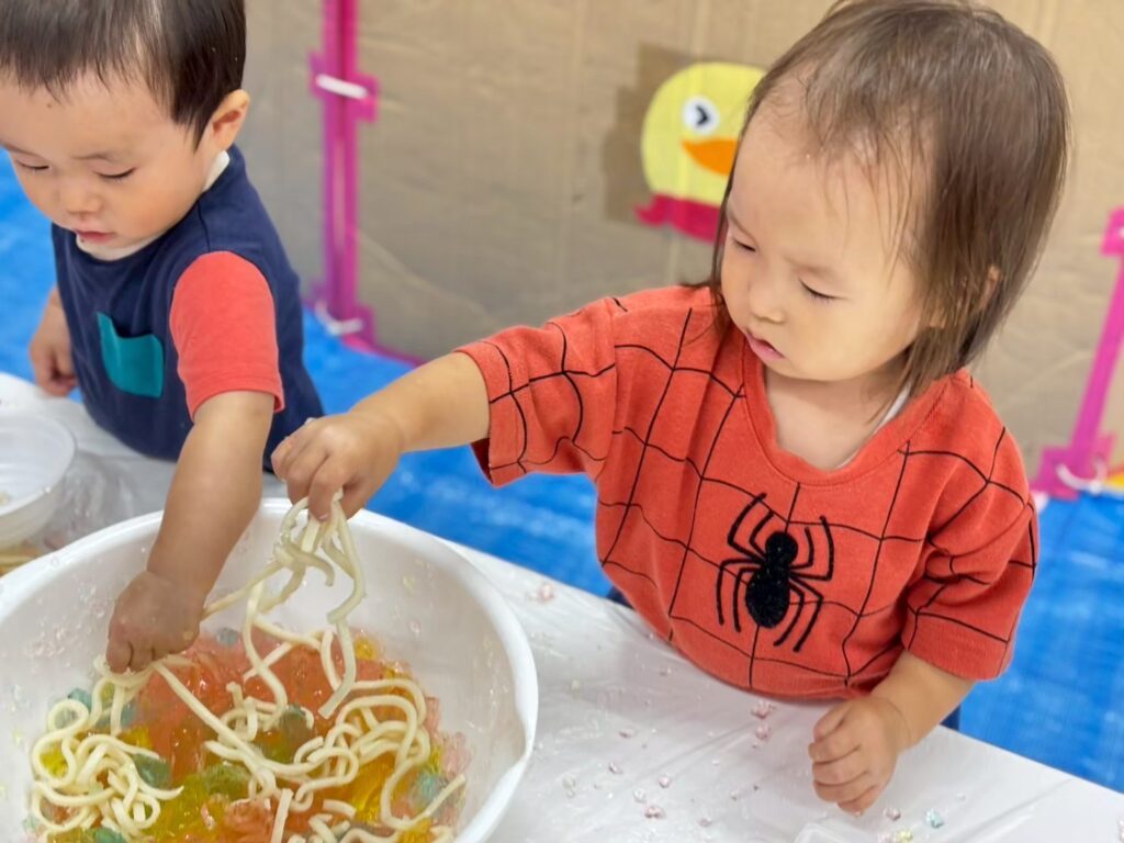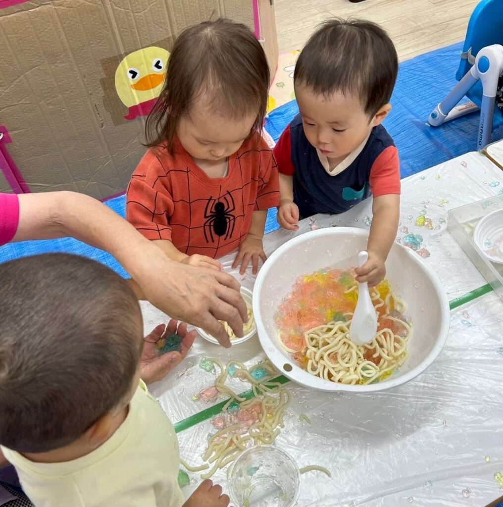 誕生日会につづいて感覚遊びを行います!