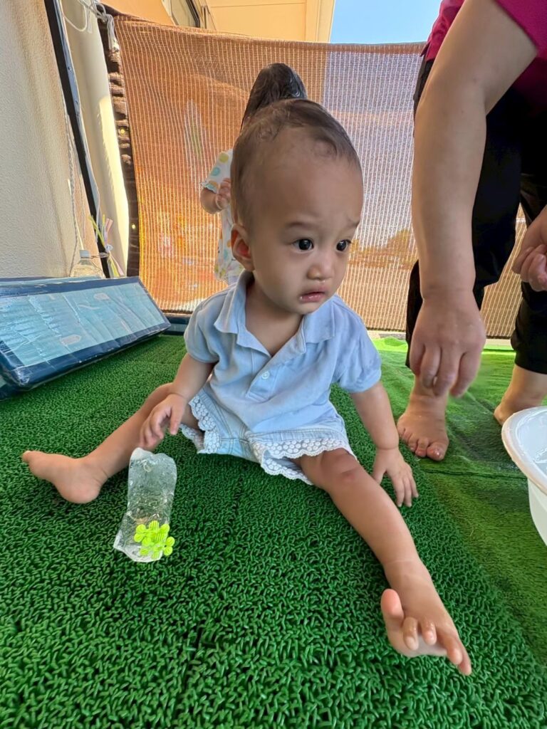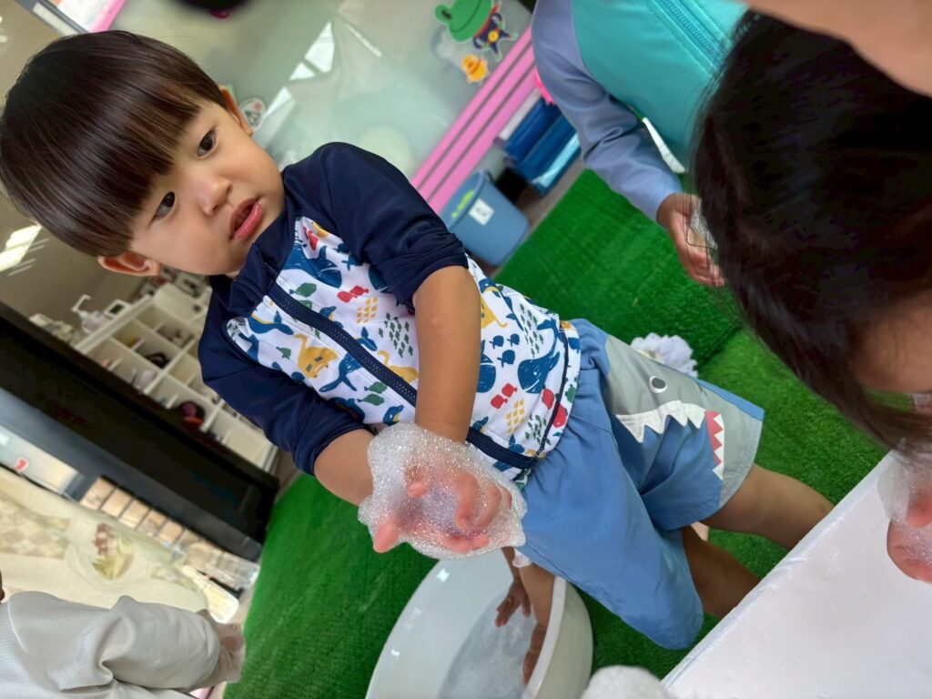 今月の感覚遊びは【つめたい・あったかいを感じよう】というテーマで、氷やお湯を触って遊びました!