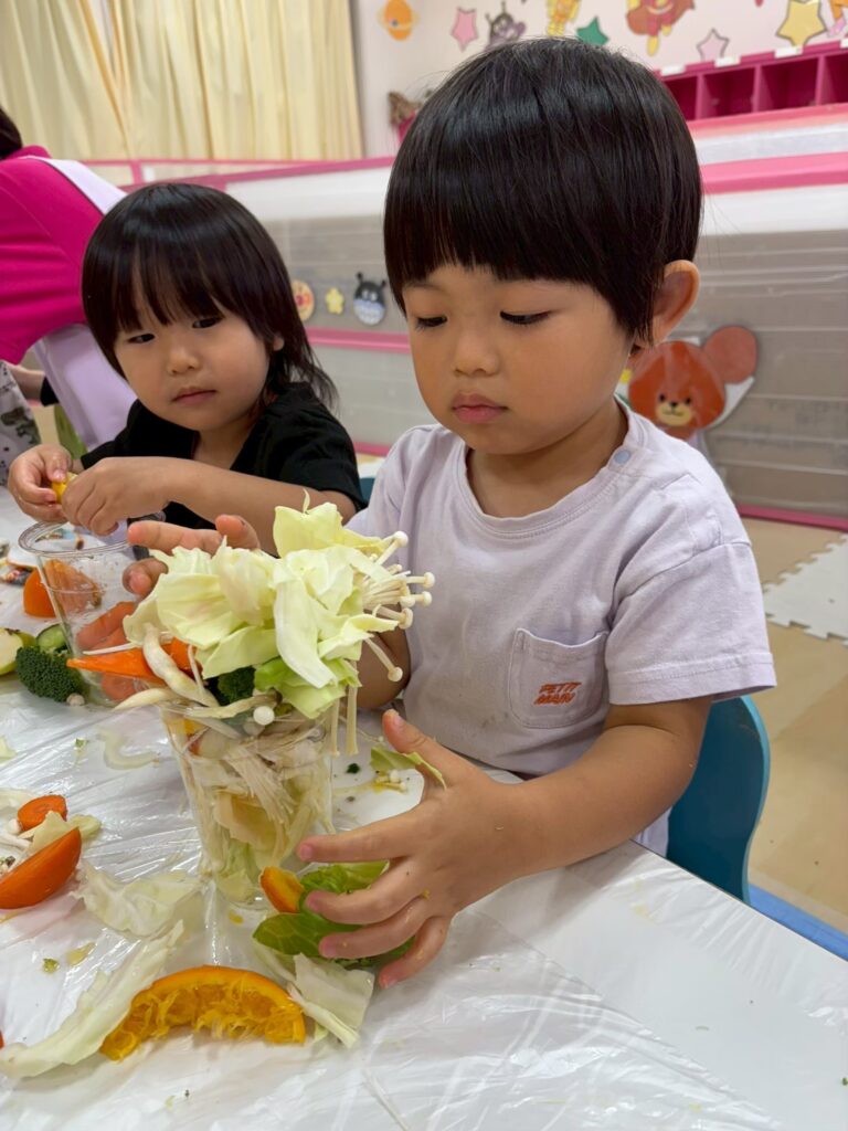ひとつずつ野菜を知った後は、いろいろな野菜を詰め合わせたパフェづくりを楽しみました♪