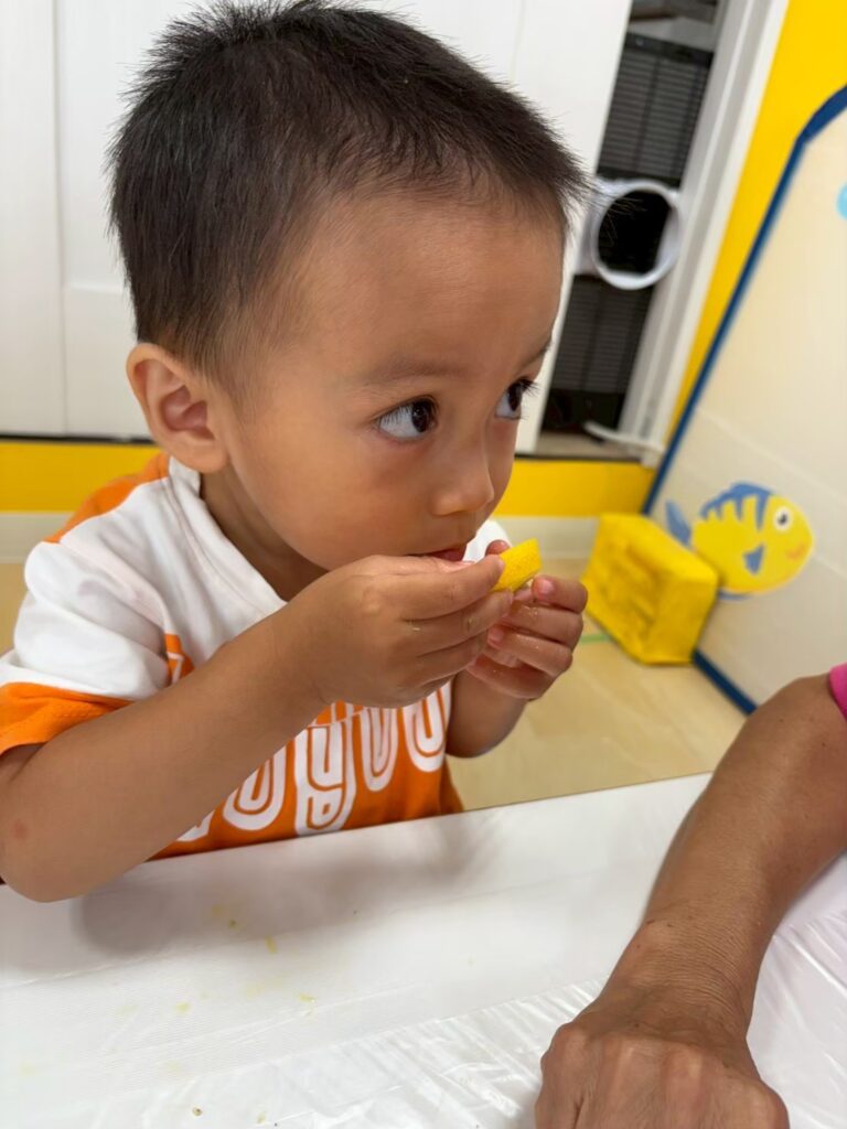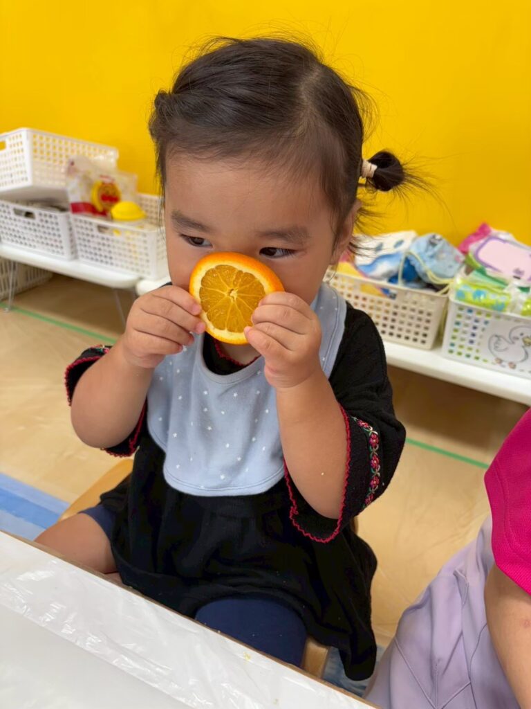 お誕生会の日のお楽しみ、今回の感覚遊びは【たべものを観察しよう!】とういうテーマで、野菜や果物に触れていきました。
