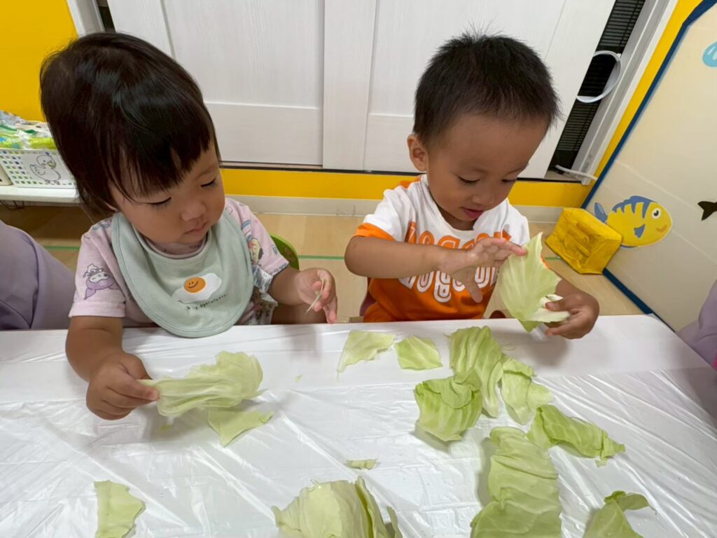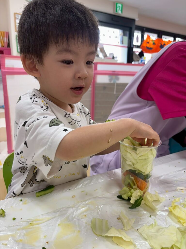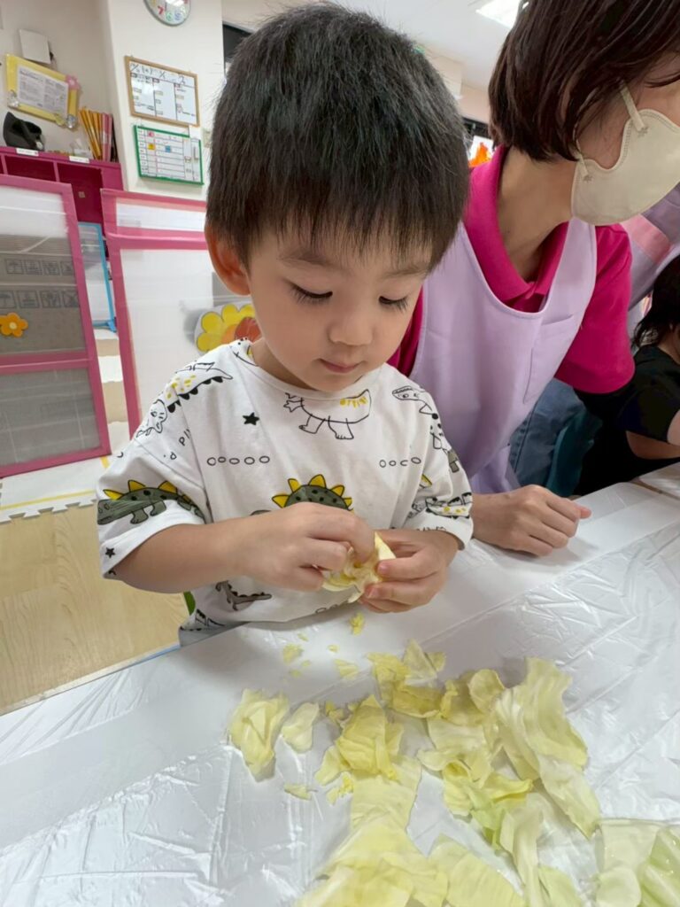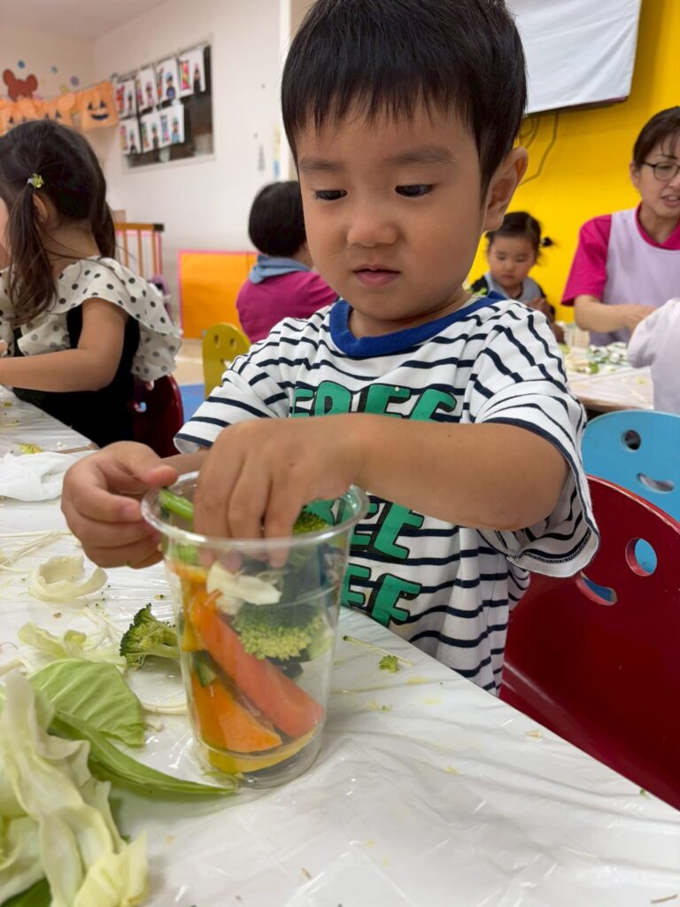いつもは細かく刻まれている野菜を、調理前の状態でみたり触れたりしながら「これ知ってる!」と興味を持ち、野菜に親しむ姿がみられました。