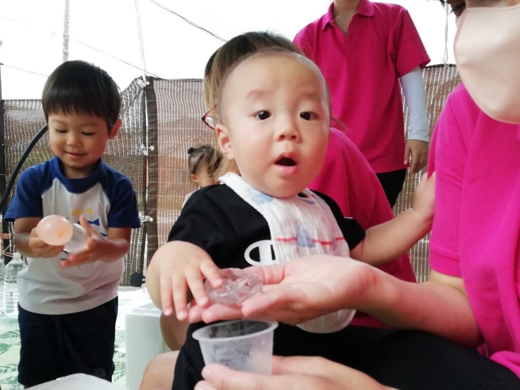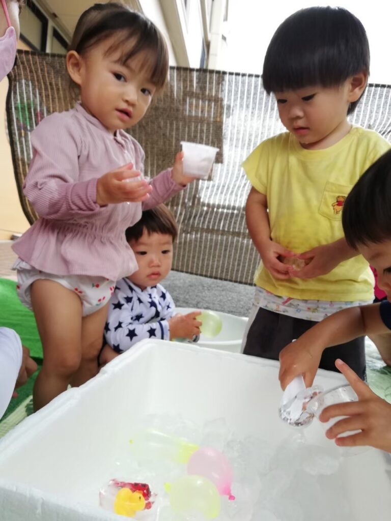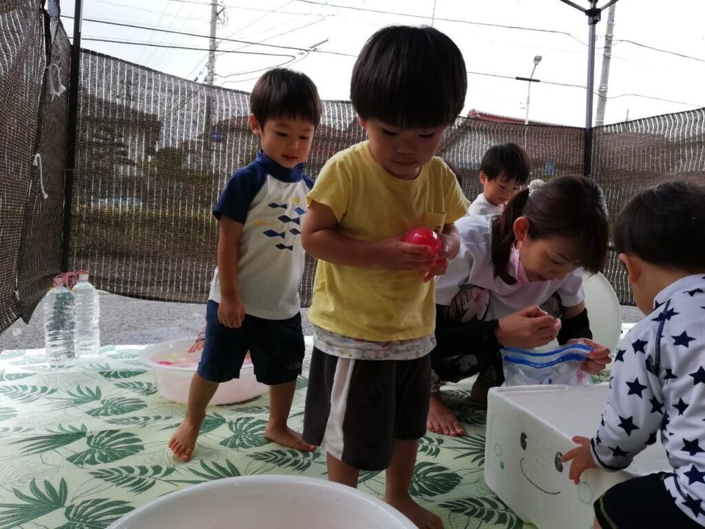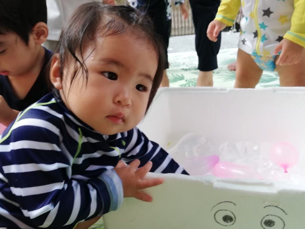 今日は氷・お湯・泡・水風船に触れて遊びましょう♪