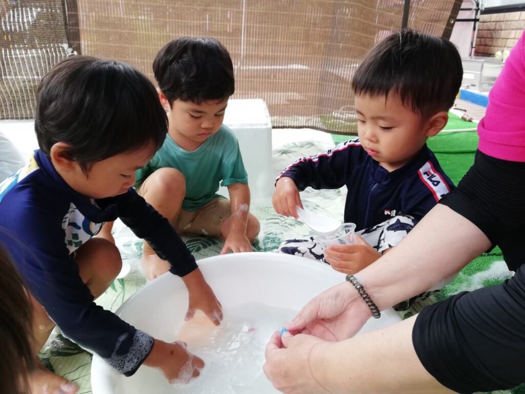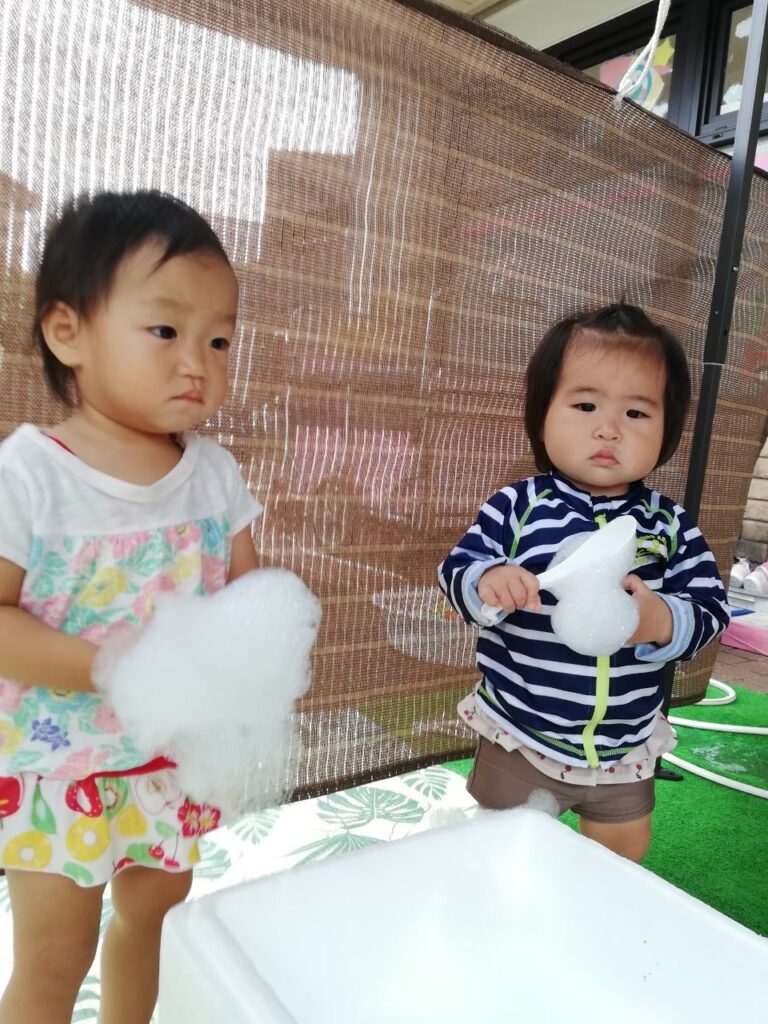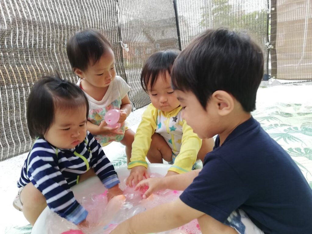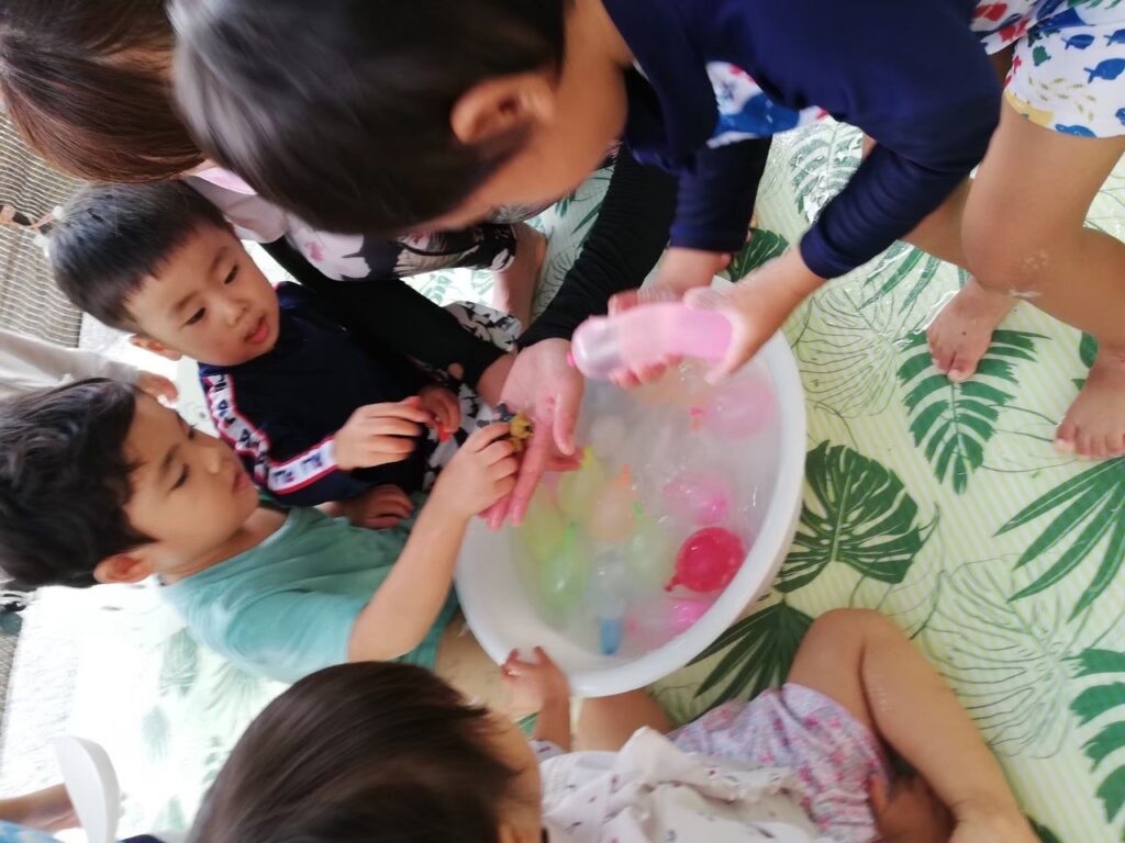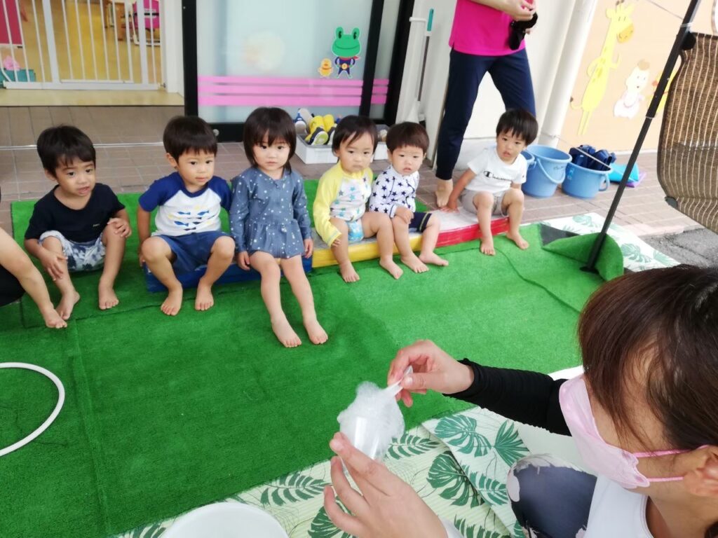 今日は氷・お湯・泡・水風船に触れて遊びましょう♪