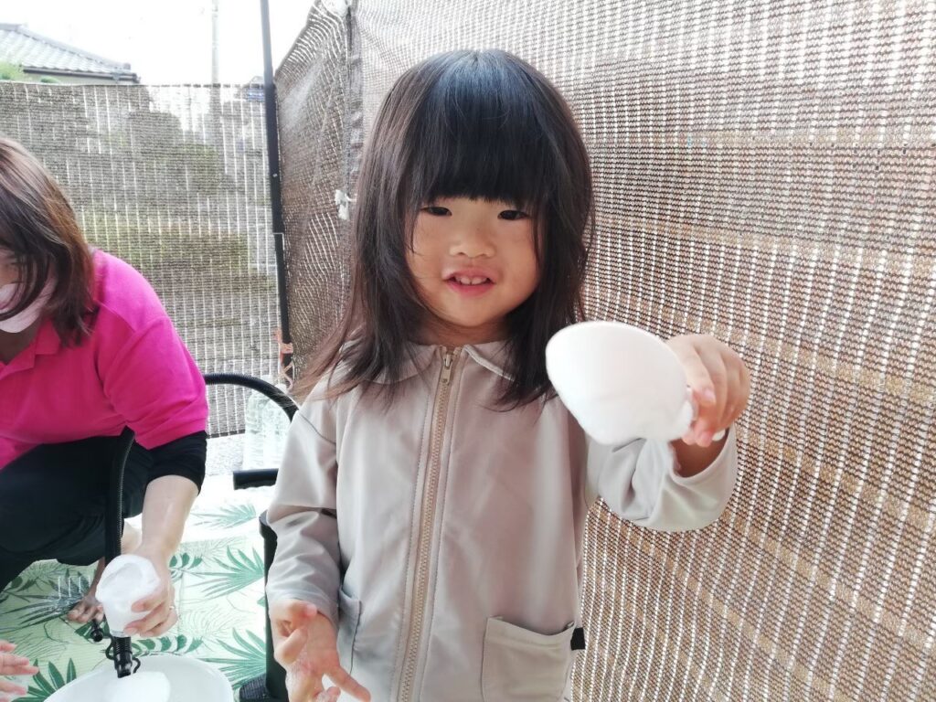 次々にいろいろな素材に触れ、積極的に参加してくれている2歳児さんです。